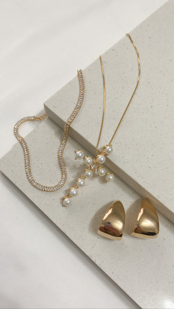 Colar Cruz Pérolas Ponto de Luz Central 45cm