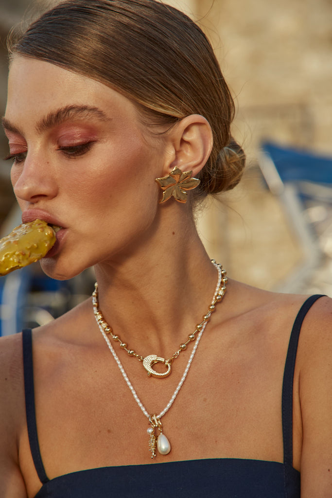 Colar de pérolas Shell no modelo formato arroz, com comprimento de 42cm, e mais extensor de 10cm.