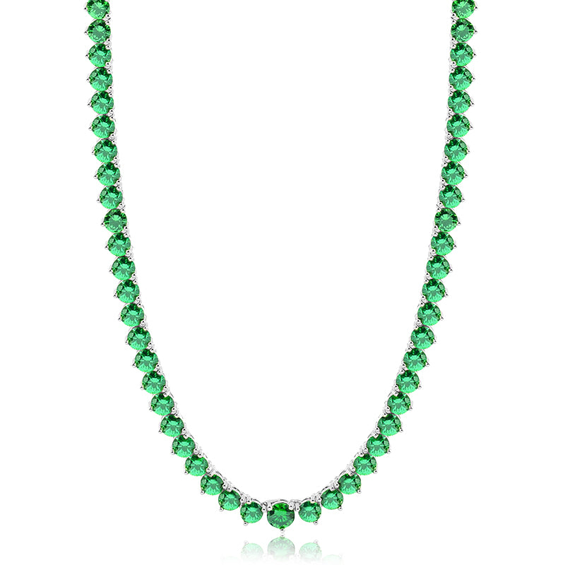 Colar riviera rígida em tons de verde degrade, na parte do fecho mais clara, até o verde esmeralda na parte central.