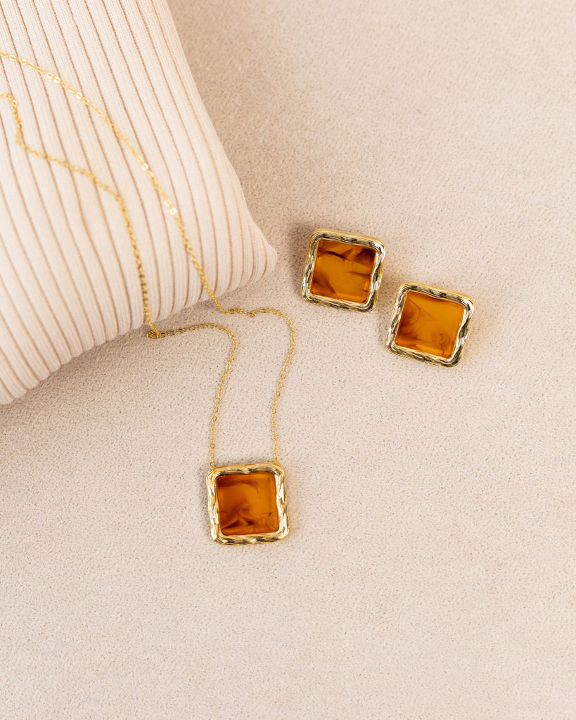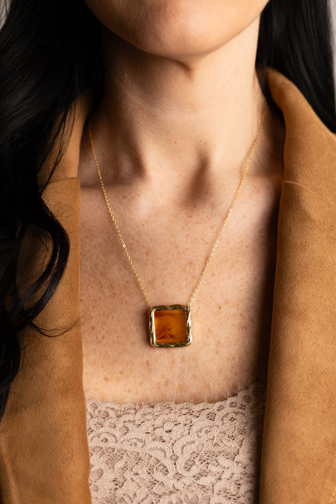 Colar com pingente quadrado resinado de 2,5cm, corrente com comprimento de 50cm, fecho e extensor de 5cm.